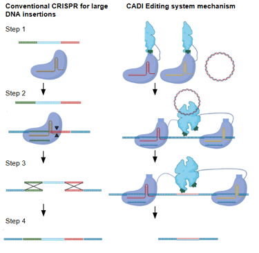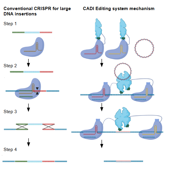 In contrast with conventional CRISPR approaches, CADI does not generate double-stranded breaks or rely on inefficient homologous recombination repair mechanisms